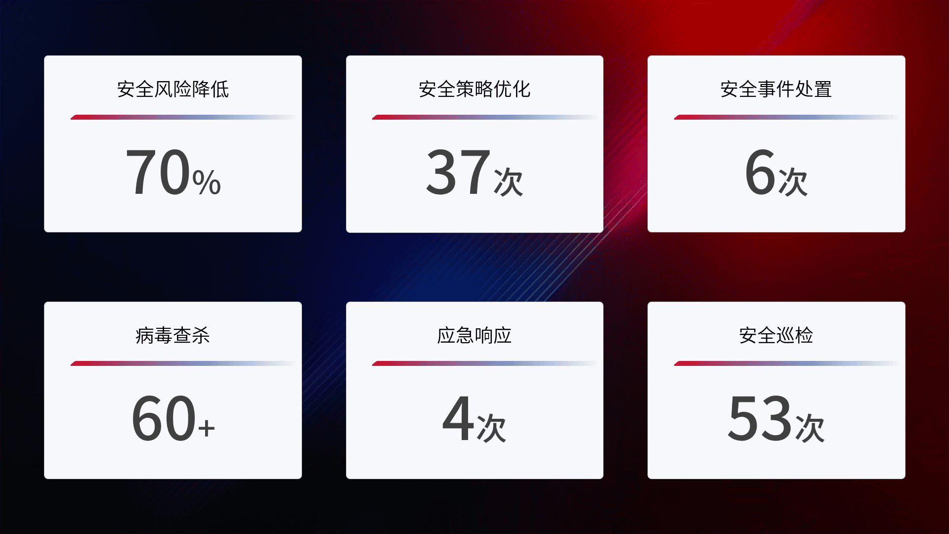 提供全面的安全事件报告体系,,,,包括处置报告、、、、周报、、、、季度和年度总结,,结合持续监控,,帮助客户深入了解网络安全状况。。。